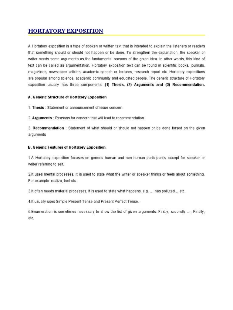 Hortatory exposition is a type english text that influences the reader to do something or act in a certain way. Hortatory exposition text can be found in scientific books, journals, magazines, newspaper articles, academic speech or lectures, research report etc. A hortatory exposition is a piece of writing that persuades the readers to accept the writer's point of view. Hortatory expositions are popular among science, academic community and educated people. Notes on the generic structure of this hortatory exposition example firstly, we have to always remember that the social function of hortatory exposition text is driving the readers to act like the writer thought as stated in the text. He shouldn't be forced to sell his nba team because of his cultural views. To strengthen the explanation, the speaker or writer needs some arguments as the fundamental reasons of the given idea. Hortatory text is one of text types of argumentative genres which has function to persuade readers. A hortatory exposition is a type of spoken or written text that is intended to explain the listeners or readers that something should or should not happen or be done. Hortatory exposition text can be found in scientific books, journals, magazines, newspaper articles, academic speech or lectures, research report etc. Hortatory exposition is a text which represent the attempt of the writer to influence the readers to do something or act in a certain way. Hortatory exposition text definition of hortatory exposition hortatory exposition is a text which represent the attempt of the writer to have the addressee do something or act in certain way. To strengthen the explanation, the speaker or writer needs some arguments as the fundamental reasons of the.